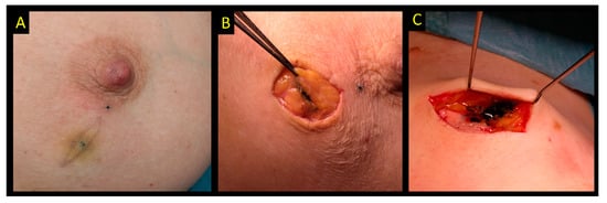 - Mazy, S.; Galant, C.; Berliere, M.; Mazy, G. Localization of non-palpable breast lesions with black carbon powder (experience of the Catholic University of Louvain). J. Radiol. 2001, 82, 161–164. [Google Scholar] [PubMed]