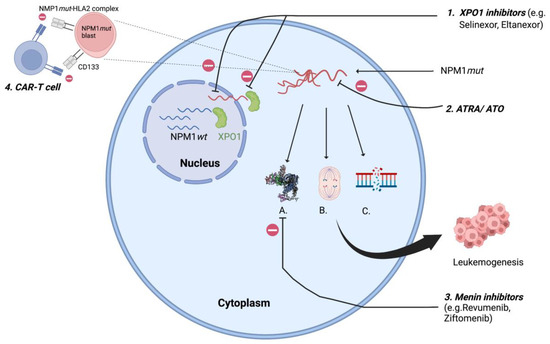 XPO1 transports NPM1mut to cytoplasm resulting in A. Homeobox (HOX) overexpression; B. Centrosome duplication; C. defective DNA repair resulting in leukemogenesis; 1. XPO1 inhibitors: inhibits XPO1 mediated cytoplasmic export of NPM1mut; 2. ATRA/ ATO: oxidative injury and apoptosis of NPM1mut cells; 3. Menin inhibitors: suppresses HOX by inhibiting menin- KMT2A complex; 4. CAR-T cell: targets NPM1mut-HLA2 complex, CD133. XPO1- exportin 1; ATRA/ATO- all-trans retinoic acid/arsenic trioxide. (Figure created using BioRender).
