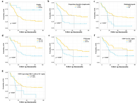 Survival curve analysis of prognostic variables with statistically significant differences. (a–d) Survival curve analyses of gender, proportion of positive lymph nodes, pathological grade, and T stage; (e–g) Survival curve analyses of TNM stage, CD39+ in CK+ region, and CD39-expressing CD8+ T cells in CK+ region. CD39, ectonucleoside triphosphate diphosphohydrolase 1; CK, cytokeratin; OS, overall survival. * p < 0.05, ** p < 0.01.