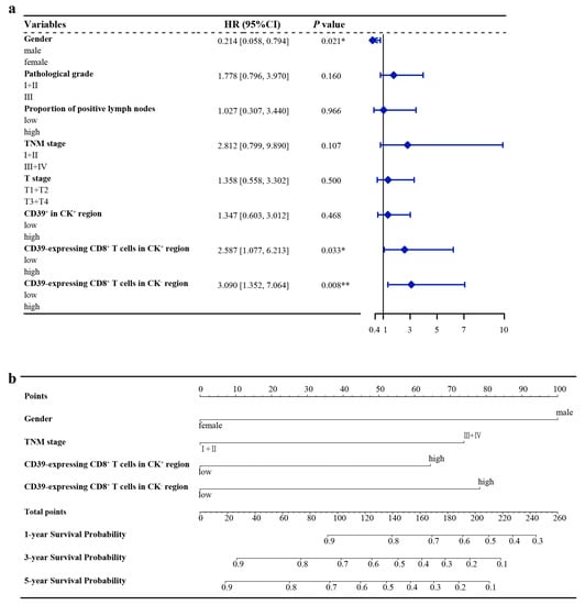 Hazard ratio of ESCC in the training group and nomogram model for OS of ESCC. (a) Hazard ratio of ESCC in the training group; (b) Nomogram model for OS of ESCC. CD39, ectonucleoside triphosphate diphosphohydrolase 1; CI, confidence interval; CK, cytokeratin; ESCC, esophageal squamous cell carcinoma; HR, hazard ratio; OS, overall survival. * p < 0.05, ** p < 0.01.