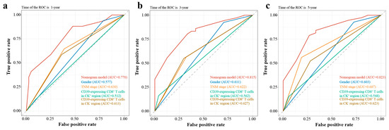The AUCs at 1, 3, and 5 years of nomogram model and other independent prognostic factors of ESCC. (a) The 1-year AUCs of nomogram model and other independent prognostic factors of ESCC; (b) The 3-year AUCs of nomogram model and other independent prognostic factors of ESCC; (c) The 5-year AUCs of nomogram model and other independent prognostic factors of ESCC. AUC, area under the curve of receiver operating characteristics (ROC); CD39, ectonucleoside triphosphate diphosphohydrolase 1; CK, cytokeratin; ESCC, esophageal squamous cell carcinoma.