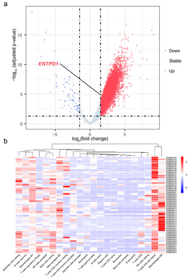 Volcano plot of differential gene expression analysis and heatmap of infiltration abundance of 22 immune cells. (a) Volcano plot of differential gene expression analysis of 41 ESCC and 12 normal tissues samples; (b) Heatmap of infiltration abundance of 22 immune cells of 41 ESCC and 12 normal tissues samples. ENTPD1, ectonucleoside triphosphate diphosphohydrolase 1.
