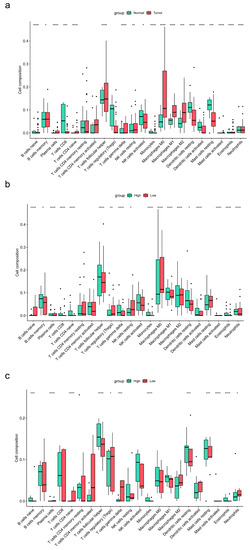 Box plots of the differences in the infiltration abundance of 22 immune cells between ESCC and normal samples and between high and low ENTPD1-expresing groups. (a) Box plot of the differences in the infiltration abundance of 22 immune cells between ESCC and normal samples; (b) Box plot of the differences in the infiltration abundance of 22 immune cells between high and low ENTPD1-expresing groups in ESCC samples; (c) Box plot of the differences in the infiltration abundance of 22 immune cells between high and low ENTPD1-expresing groups in normal samples. ENTPD1, ectonucleoside triphosphate diphosphohydrolase 1; ESCC, esophageal squamous cell carcinoma. * p < 0.05, ** p < 0.01, *** p < 0.001, **** p < 0.0001.