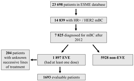 We conducted a noninterventional, retrospective study to describe the outcome of patients with HR+/HER2− MBC treated with everolimus, selected in the ESME-MBC database. The ESME-MBC database is a national metastatic breast cancer cohort that collects retrospective data using clinical trial-like methodology, including quality assessments. The ESME-MBC database was built from existing information systems, treatment databases, and patients’ electronic medical records, with homogenous onsite-collected information and high-level quality control. The whole methodology was previously extensively detailed in [10].