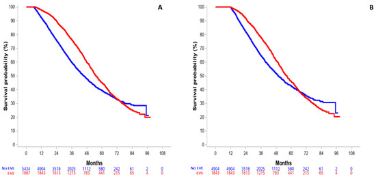Landmark analysis of overall survival in the entire population, according to minimal follow-up. (A) 6-month landmark OS. (B) 12-month landmark OS.