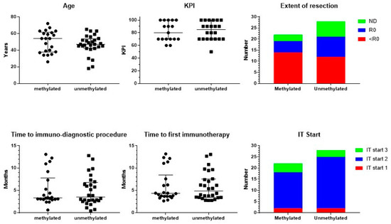 Patient characteristics. Patients were divided into those suffering from MGMT promoter-methylated (n = 22) or -unmethylated (n = 28) GBM. The individual distribution of age and Karnofsky performance index (KPI), including median and interquartile range, is shown. The figure on extent of resection includes the number of patients with complete resection (R0), biopsy or noncomplete resection (<R0), and not documented (ND). In the lower panel, time in months from neurosurgery to the immune-diagnostic procedure at the IOZK, and to the start of the first immunotherapy at the IOZK, for both groups of patients is shown, including median and interquartile range. In the lower panel right figure, the patients are categorized according to the start of the immunotherapy (IT Start): patients who started immunotherapy without additional chemotherapy (IT Start 1), patients who started ICD immunotherapy during the temozolomide maintenance chemotherapy (IT Start 2), and patients who started individualized multimodal immunotherapy after maintenance chemotherapy (IT Start 3).