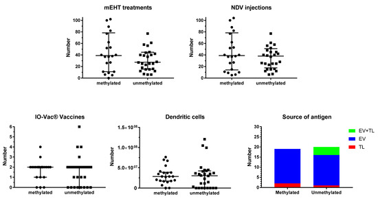 Treatment details. Patients were divided into those suffering from MGMT promoter-methylated (n = 22) or -unmethylated (n = 28) GBM. The individual distribution of number of sessions of modulated electrohyperthermia (mEHT) and injections of Newcastle disease virus (NDV) are shown in the upper panel, including median and interquartile distribution. In the lower panel, the total number of IO-Vac® vaccines and the total number of dendritic cells injected per patient are shown, including median and interquartile distribution. In the right lower panel right, the source of antigen for loading into the DC vaccine (IO-Vac®) for each patient, who received IO-Vac®, is shown: TL = tumor lysate; EV = extracellular vesicles: Immunogenic cell death-induced serum-derived antigenic extracellular microvesicles and apoptotic bodies; EV + TL = combination of both sources of antigen.