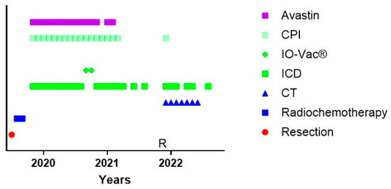 Treatment schedule of a female suffering from GBM in the context of POLE syndrome. The treatment schedule of a female with POLE syndrome is shown. CT = maintenance temozolomide; ICD = immunogenic cell death immunotherapy; IO-Vac® = dendritic cell vaccine; CPI = checkpoint inhibitor anti-PD1 monoclonal antibody; R = multifocal relapse.