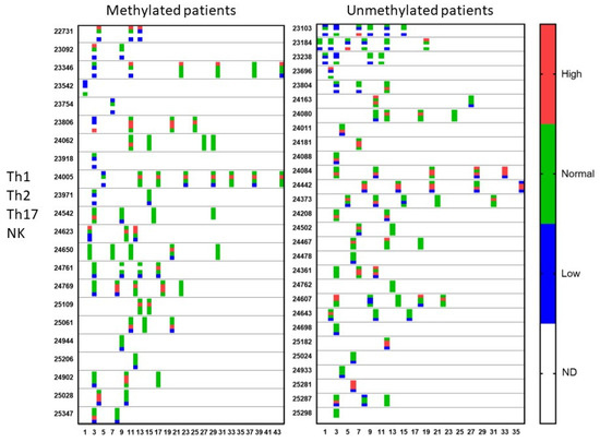 Qualitative immune function during treatment. Patients were divided into those suffering from MGMT promoter-methylated (n = 22) or -unmethylated (n = 28) GBM. At different time points during treatment (expressed in X-axis as months), the immune functioning was followed for the Th1 function, Th2 function, Th17 function, and NK cell cytotoxicity. The data are categorized as higher or lower than or within (normal) the reference range, determined by the laboratory. For each patient and for each test in the time, the four dots for the four tests with the respective color are shown. ND = test not done.