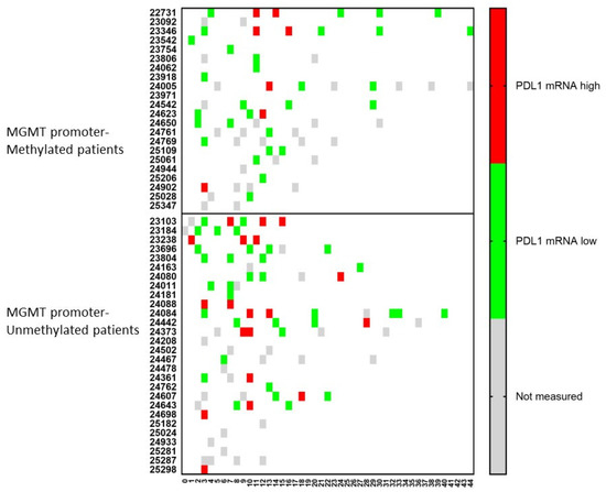 An important molecule in tumor cells is the expression of PDL1 on its surface. Therefore, the mRNA expression for PDL1 was followed-up in the CCCs in both the MGMT promoter-methylated and -unmethylated patients (Figure 5). At the time of immune-diagnostic blood sampling, only 5 (1 + 4) patients showed mRNA expression for PDL1 out of 27 (14 + 13) samples containing CCCs. However, following mRNA expression for PDL1 in CCCs over time, four more patients in the MGMT promoter-methylated group, and seven more patients in the MGMT promoter-unmethylated group showed positive expression for mRNA for PDL1 in at least one sample.