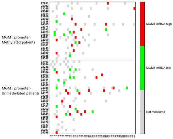 During the 6.5-year observation period, the MGMT mRNA expression analysis became available as a chemosensitivity test for TMZ, and became included in the immune-diagnostic evaluation. Based on the pathology report, 22 patients were registered as MGMT promoter-methylated. We analyzed the data within the first 4 months after surgery. In 17 patients, the mRNA for MGMT was not measured because the blood sampling was not yet performed, because there were no CCCs detected, or because the MGMT analysis for mRNA expression on CCCs was not available. CCCs were categorized as low for mRNA for MGMT in 3 patients, and high in 2 patients. For the 28 MGMT promoter-unmethylated patients, there were no measurements available within the first 4 months in 21 patients, while 4 patients showed low RNA expression and 3 patients showed high RNA expression for MGMT in their CCCs.