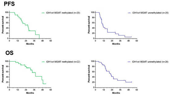 All patients treated between 27 May 2015 and 1 January 2022 were taken into the data set, with a further observation period for surviving patients extended to 1 July 2022. A retrospective analysis of these patients was performed. There were 218 patients with a diagnosis of GBM. We next selected the GBM patients older than 18 years with a documented IDH1 status. There were 110 patients with IDH1 status documented as wild type. We finally focused on the patients with the first event of IDH1 wild-type GBM and documented methylation status of the MGMT promoter. The categorization of the patients as MGMT promoter methylated or unmethylated was based on the available pathology report. There were 22 patients with MGMT promoter-methylated and 29 patients with MGMT promoter-unmethylated status. In the latter group, one patient was lost for follow-up. The final study population therefore consisted of 50 patients.