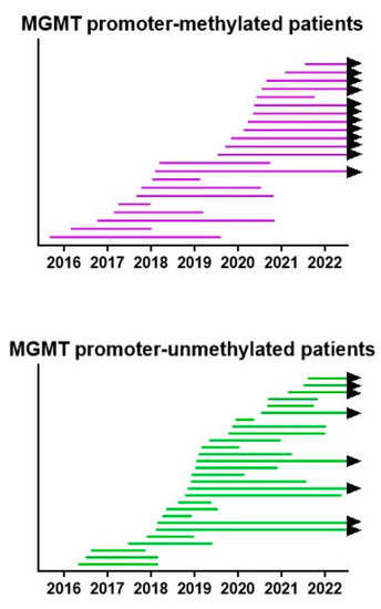 All treatments were provided under the legal frame of “individueller Heilversuch”. In this context, the best possible treatment plan, based on a translation of the most recent insights, was discussed with each patient and was provided after informed consent. Therefore, the treatment plans were modified, patient per patient, and within each patient during the course of the disease over the 6.5-year period. We created a swimmer plot showing the lifespan per patient from operation to death or analysis. The data are shown in Figure 8. In both MGMT promoter-methylated and -unmethylated patients, an improvement in the lifespan of the patients was realized starting from 2018, as compared to the initially treated patients.