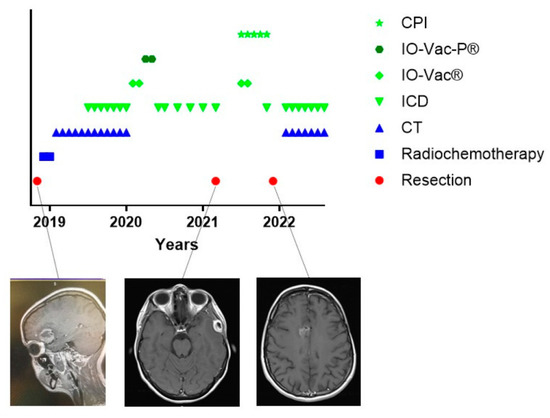 Treatment schedule of a female suffering from relapsing GBM. The treatment schedule of a female patient with GBM. The treatment for the first event of this patient was published [31]. Further evolution with two new relapses is shown. The original tumor (left), the extracerebral intracranial first relapse (middle), and the diffuse relapse at the contralateral side (right) are shown in exemplary MRI images. The predicted neoepitopes in the first tumor and last tumors are described in Table 2. CT = maintenance Temozolomide; ICD = immunogenic cell death immunotherapy; IO-Vac® = dendritic cell vaccine; IO-Vac-P® = dendritic cell vaccine loaded with tumor-specific neoepitopes; CPI = checkpoint inhibitor anti-PD1 monoclonal antibody.
