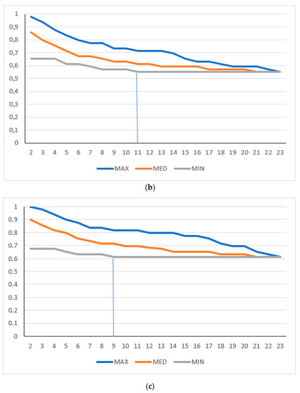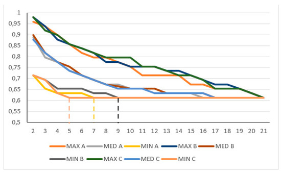 Partly overlapping simplified ONEST plots of 3 randomly selected 100 permutations (A, B, and C) for the <50% sTIL or more classification in C1 circulation without the two divergent classifiers; this example showed the lowest p-value in the Kruskal–Wallis test. Note: the y-axis only represents values between 0.5 and 1; despite not being statistically significantly different, the 3 randomly selected ONEST plots of 100 permutations yield 3 different ONEST values: 7 (A), 9 (B), and 5 (C) (to ease reading of the values, these are highlighted by vertical dashed segments between the x-axis value and the minimum curves), whereas the bandwidth is very similar (0.245 A, 0.265 B and C), and by definition, the OPA(21) value is identical (0.612). MAX: maximum curve; MED: median curve; MIN: minimum curve.