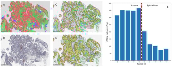 (A). Tissue classification results. (B). Cell classification results. (C,D). Infiltration analysis was performed on stromal and epithelial compartments. The 500 µm measures were added for reference. (E). CD8+ cell density distribution by ranks in an example case.