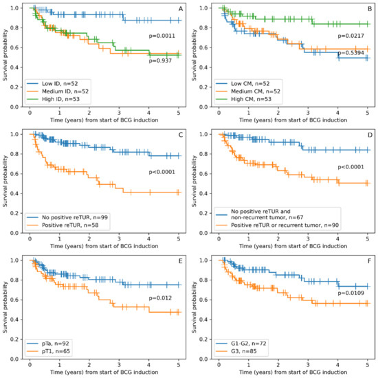 Non-parametric survival analyses once again supported our finding from univariable Cox regression analysis, with all six features separating patient groups with statistically significant differences in RFS (Figure 2). The low ID group of patients showed significantly longer RFS, similar to the high CM group, which was expected due to the strong inverse correlation of these indicators. The traditional pathologic factors of tumor stage and grade also separated groups with significantly different RFS. The presence of tumors in reTUR was associated with a significantly shorter RS. However, the combined factor of recurrent tumors and/or the presence of tumors in reTUR extracted a larger group of patients with shorter RFS, resulting in a somewhat better balanced risk stratification.