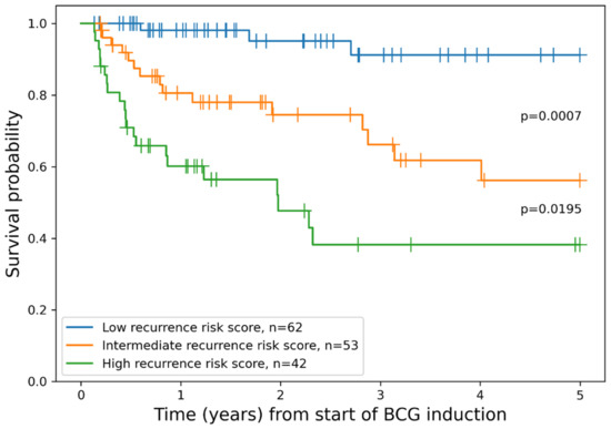 Bladder cancer is the tenth most common cancer diagnosed in the world [1], with around three-fourths of the cases being non-muscle-invasive bladder cancer (NMIBC) [2]. Several risk assessment systems have been developed based on traditional tumor properties (grade, stage, size, multifocality, presence of carcinoma in situ, and previous history of recurrence) to support therapy decisions for NMIBC patients [3,4,5,6]. For high- and intermediate-risk patients, the main option of adjuvant treatment is intravesical Bacille Calmette–Guérin (BCG) immunotherapy, which has been demonstrated to reduce relapse, progression, and death rates in NMIBC patients [2]. Nevertheless, over 30% of patients experience tumor recurrence after BCG immunotherapy; therefore, better predictive and clinical-decision support tools are in demand [7].