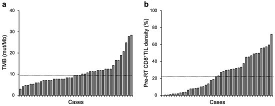 Overview of TMB (a) or pre-RT CD8+TIL density (b) in patients with cervical cancer treated with definitive radiotherapy (n = 44). Dashed lines indicate median values: 9.5 mut/Mb and 22.5% for TMB and pre-RT CD8+TIL density, respectively.