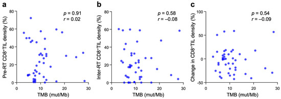 Correlation between TMB and pre-RT CD8+TIL density (a), inter-RT CD8+TIL density (b), or changes in CD8+TIL density between the two timepoints (c) in patients with cervical cancer treated with definitive radiotherapy (n = 44). p and r values, calculated by Spearman’s rank correlation test, are shown.