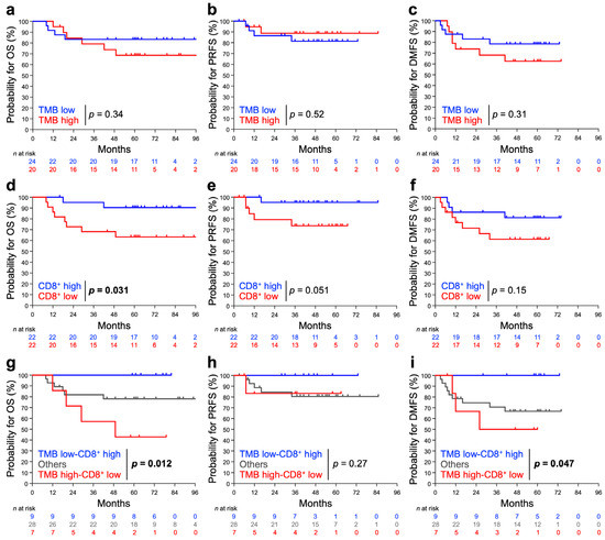 Probability of OS, PRFS, and DMFS stratified by TMB (a–c), pre-RT CD8+TIL density (d–f), or the two factors in combination (g–i). (a,d,g) OS. (b,e,h) PRFS. (c,f,i) DMSF. The patients were dichotomized with TMB or with pre-RT CD8+TIL density using the median: 9.5 mut/Mb and 22.5%, respectively. p values assessed by the log-rank test are shown.