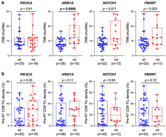Recurrent mutations were observed in PIK3CA (43.1%), ARID1A (34.0%), NOTCH1 (27.2%), FBXW7 (25.0%), FGFR3 (20.4%), EP300 (18.1%), FGFR4 (13.6%), and TP53 (6.8%); this mutation spectrum was broadly consistent with that reported in the landmark studies [26,27]. The association between TMB or pre-RT CD8+TIL density and mutation profile was analyzed to identify genes whose mutation prevalence was >20%. The results showed that the TMB in ARID1A-mutant tumors was significantly greater than in ARID1A-wild-type tumors (p = 0.0008), whereas the TMB did not differ significantly between mutant and wild-type tumors with respect to PIK3CA, NOTCH1, or FBXW7 (Figure 4a). A trend toward greater pre-RT CD8+TIL density in ARID1A-mutant tumors was observed (p = 0.11), whereas pre-RT CD8+TIL density did not differ significantly between mutant and wild-type tumors with respect to PIK3CA, NOTCH1, or FBXW7 (Figure 4b).