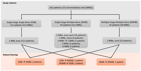 The study cohort and patient group overlap. Seven single-stage single-bone (SSSB) subjects had single intramedullary nails (IMNs) placed twice during separate hospitalizations and were counted as 14 unique events, whereas 13 single-stage multiple-bone (SSMB) patients had their surgery preceded or followed by a single-nail insertion during the same hospitalization and were counted in the SSMB cohort for statistical analysis despite them technically undergoing staged procedures. Four SSMB/MSMB (multiple-stage multiple-bone) patients were also considered in the SSSB group as they had a single nail placed in a different hospitalization either before or after the current hospitalization. There was one patient who had undergone a single- and multi-stage multiple-bone nailing procedures during two separate hospitalizations and was included in both SSMB and MSMB groups.