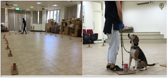 Dogs training. The target was randomly placed in a jar, and the dog leader brought the dog forward for detection. If there was a reaction to the target, a positive response was recorded; otherwise, a negative response was recorded. Response to non-targets was recorded as a false positive. Dogs were trained to sit down as a reaction and given a food reward if the reaction was positive.