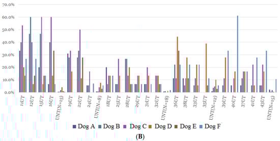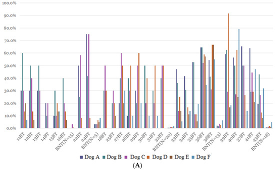 Table 2 shows the individual and total average lung cancer diagnostic rates of the dogs trained using lung cancer tissue samples; the rates of discriminating lung cancer and non-lung cancer using exhaled gas and urine samples were also reported. The rate of lung cancer diagnosis through the recognition of exhaled gases ranged from 15.5% to 40.9% (average range), with an average of 27.7% in lung cancer patients. Using exhaled gases, lung cancer recognition after tissue training had a sensitivity of 50.4% and a specificity of 50.1%. Figure 2 shows individual canine response rates to exhaled breath (Figure 2A) and urine samples (Figure 2B) collected from patients with a confirmed diagnosis of lung cancer, from patients with a confirmed diagnosis of non-lung cancer, and from healthy controls after using lung cancer tissue training. The experimental results at the second stage of training found that after lung cancer tissue training, dogs recognize lung cancer and healthy controls more than through breath training: the response rate to exhaled breathing target samples was about 8–55%; for urine target samples, it was only about 5–30%.