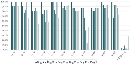 Individual canine response rates after using breathing target training. Individual canine response rates to exhaled breathing samples collected from patients with a confirmed diagnosis of lung cancer and from healthy controls after using breathing target training.