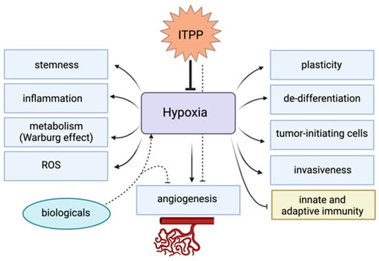 Hypoxia-mediated effects affecting various processes of tumors and the tumor microenvironment. ITPP, myo-inositol-trispyrophosphate; ROS, reactive oxygen species.