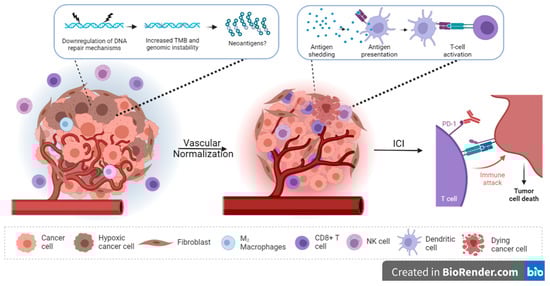 Findings from various studies have been recently combined to propose an updated evolutionary model for PDAC, where often a simple KRAS-activating mutation transforms a ductal epithelial cell, contributing to low-grade pancreatic intraepithelial neoplasia (PanIN). Subsequent incursion of loss of tumor suppressors involved in the cell cycle control, namely TP53, CDKN2A and/or SMAD4, promote cell growth and the progression of the lesion to high-grade PanIN. An unknown trigger, which could be telomere loss, promotes complex mitotic errors manifesting as polyploidy in most cases, and chromothripsis in others, enables faster acquisition of structural alterations and copy number variations (CNVs). The result is rapid proliferation, heterogenous driver and pathway alterations, a compendium of transcriptional subtypes, KRAS allelic imbalance, invasion, and dissemination [12]. On the other hand, in KRAS wildtype (WT) PDACs, which represent 10.7% of cases, a recent report determined that TP53 is the most frequently mutated gene closely followed by BRAF [13], while gene amplification and fusion events occur in 10% and 21% of KRAS WT cases, respectively [13]. In addition, a small fraction of PDACs present with single base substitution (SBS) signatures of homologous recombination deficiency (HRD) (10%) or dMMR-related signatures (1–2%). HRD and dMMR are primarily due to germline alterations in BRCA1, BRCA2, PALB2 or RAD51C involved in the homologous recombination repair (HRR) pathway, or MLH1, MSH2, MSH6 or PMS2 involved in MMR. Germline alterations are followed by a second somatic mutation, leading to biallelic inactivation [14,15,16]. CNVs and structural variants have also been surveyed in PDAC genomes distributing them into four subtypes. This included an “unstable” subtype, which harbors greater than 200 variants [17], and was found to be associated with the HRD signature. Of interest, a recent study correlated readouts from transcriptome-based hypoxia gene signatures across tumor types with copy number signature attributes. The authors reported a significant positive correlation between hypoxia as determined by these signatures, and attributes related to HRD and aneuploidy [18]. Indeed, hypoxia has been associated with the increase in genomic instability and TMB [19,20,21,22,23,24]. In that respect, hypoxia could potentially increase neoantigen load, thus giving rise to the emergence of cancer clones that could potentially be recognized as non-self and be eliminated by the immune response. For that to be achieved however, anti-tumor immune cells need to be within the tumor mass, which is a rare scenario in PDACs that are branded as being immune-cold tumors characterized by a highly desmoplastic, hypovascularized, and hypoxic TME [25,26].