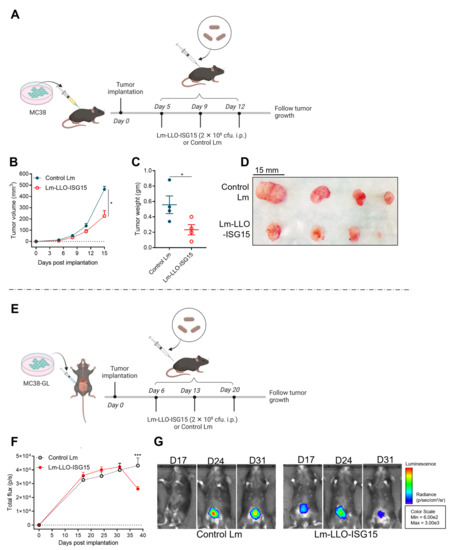 For subcutaneous studies, 5 × 105 MC38 cells were suspended in 100 µL PBS and implanted subcutaneously (s.c.) into the right hind flank of C57BL/6 female mice. All of the mice were then randomized to receive PBS, Control Lm, or Lm-LLO-ISG15 intraperitoneally. Tumor measurement was carried out every 2–3 days by digital caliper and tumor volume was calculated using the formula (length × width × width)/2. All of the mice were followed for illness until they became moribund, or when tumors reached the burden limit, i.e., 15 mm in either dimension.