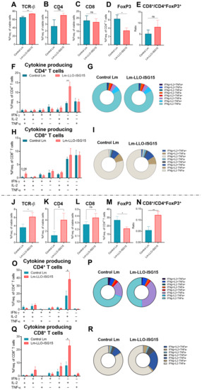 Induction of anti-tumor immune response with Lm-LLO-ISG15 in subcutaneous versus orthotopic CRC tumors. Single cells were prepared from tumors of experiment of Figure 5A and stained with different fluorochrome-conjugated antibodies as mentioned in Materials and methods. (A–E) Frequencies of live (A) TCR-β+, (B) CD4+, (C) CD8+, (D) CD4+FoxP3+, and (E) Ratio of Ratio of CD8+% TCR-β+/CD4+FoxP3+% TCR-β+. (F,G) Multi-cytokine produced by live CD4+ T cells. (H,I) Multi-cytokine produced by live CD8+ T cells. Similarly, single-cell suspensions of tumors from experiment of Figure 5E were subjected to multicolor flow cytometry. (J–N) Frequencies of live (J) TCR-β+, (K) CD4+, (L) CD8+, (M) CD4+FoxP3+, and (N) Ratio of Ratio of CD8+% TCR-β+/CD4+FoxP3+% TCR-β+. (O,P) Distribution of multi-cytokine produced by live CD4+ T cells. (Q,R) Distribution of multi-cytokine produced by live CD8+ T cells. Data were analyzed using unpaired t-test. All error bars are shown as mean ± SEM. ns: non-significant, * p < 0.05 and ** p < 0.01.
