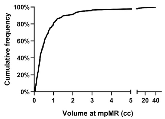 Cumulative frequency of the volume of local disease at mpMRI for patients with positive DCE-MRI. Abbreviations: mpMRI: multiparametric magnetic resonance imaging; DCE-MRI: dynamic-contrast-enhanced magnetic resonance imaging.