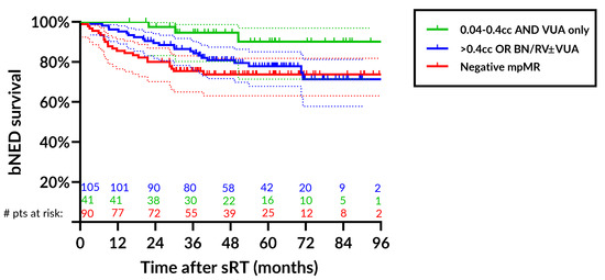 Biochemical control rates after salvage radiotherapy stratified by the location of the lesion (none, VUA-only, BN/RV ± VUA) and by the volume of the lesion at DCE-MRI using as a cutoff a median value of 0.4 cc. For patients with VUA-only disease up to 0.4 cc, the bNED rate at 4 yrs was 94.6% (95%CI: 80.2–98.6%) (green line), for patients with >0.4 cc or other detectable lesions (BN/RV ± VUA), the 4 yr bNED rate was 80.9% (95%CI: 71.6–87.4%) (blue line) and 73.7% (95%CI: 63.1–81.8%) (red line) for patients with negative mpMRI. Abbreviations: bNED: biochemical no evidence of disease; sRT: salvage radiotherapy; VUA: vesico-urethral anastomosis; BN: bladder neck; RV: retro-vesical space; DCE-MRI: dynamic-contrast-enhanced magnetic resonance imaging; yrs: years; mpMRI: multiparametric magnetic resonance imaging.