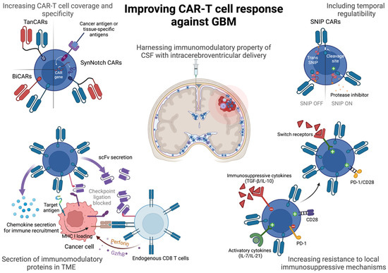 In a first-in-human clinical trial, O’Rourke et al. used a single dose of EGFRvIII-CAR-T cells injected systemically in 10 patients with EGFRvIII-positive recurrent GBM [17]. Although clinical benefit was not observed in this study, surgical intervention of seven of the patients allowed comparison of the tumor microenvironment (TME) after CAR-T therapy. CAR-T cells were found to infiltrate the tumor from systemic circulation, but there was also increased infiltration of regulatory T cells (Tregs) into the tumor and increased expression of inhibitory molecules, such as IDO (secreted by immunosuppressive myeloid cells), IL-10, TGFb and PD-L1, in the tumor in some patients. Loss of the EGFRvIII antigen was also observed in the patients, which along with the increase in immunosuppressive milieu of the tumor, likely resulted in attenuation of CAR-T cell efficacy. In another study, Goff et al. used preparative chemotherapy, which can reduce the burden of myeloid derived suppressor cells (MDSCs) and Tregs, before adoptive transfer of CAR-T cells to 18 patients and used IL-2 infusions to support CAR-T expansion [18]. Despite the greater persistence of CAR-T cells in this study, most likely due to the depletion of MDSCs and Tregs, there were no objective responses. These results show that making CAR-T cells resistant to the unique immunosuppressive background of GBM and increasing antigen coverage would tremendously improve their functionality in GBM.