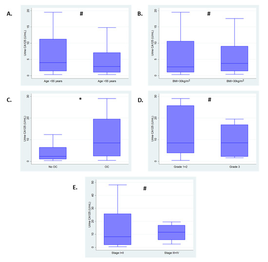 Box plots of urine CA125 (U/mL) levels and clinico-pathological features. (A) Age (<55 years vs. >55 years). (B) BMI (<30 kg/m2 vs. >30 kg/m2). (C) Disease status (no ovarian cancer vs. ovarian cancer). (D) Grade (low grade vs. high grade). (E) FIGO Stage (early stage vs. late stage). Significance calculated using Mann-U Whitney test * p-value < 0.05. # p-value ≥ 0.05. Outliers excluded from plots. OC—ovarian cancer.