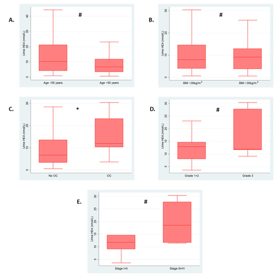 Box plots of urine HE4 (nmol/L) levels and clinico-pathological features. (A) Age (<55 years vs. >55 years). (B) BMI (<30 kg/m2 vs. >30 kg/m2). (C) Disease status (no ovarian cancer vs. ovarian cancer). (D) Grade (low grade vs. high grade). (E) FIGO Stage (early stage vs. late stage). Significance calculated using Mann-U Whitney test * p-value < 0.05. # p-value ≥ 0.05. Outliers excluded from plots. OC—ovarian cancer.