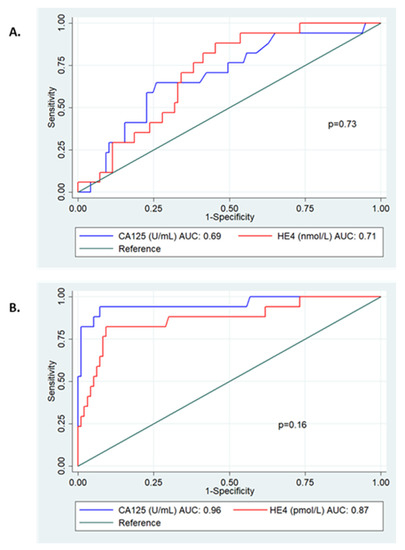 ROC curve analysis of serum and urine CA125 and HE4 for the detection of epithelial ovarian cancer. (A) Urine CA125 and HE4. CA125: AUC 0.69 (95% CI 0.55–0.82), HE4: AUC 0.71 (95% CI 0.60–0.82), p = 0.73. (B) Serum CA125 and HE4. CA125: AUC 0.96 (95% CI 0.89–1.00), HE4: AUC 0.87 (95% CI 0.76–0.98), p = 0.18.