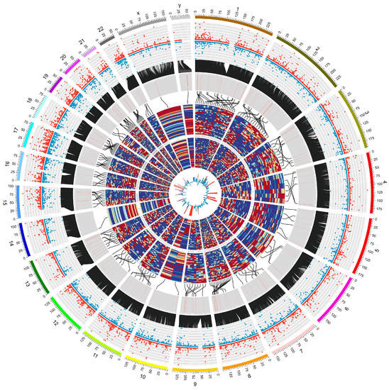 - Krzywinski, M.; Schein, J.; Birol, I.; Connors, J.; Gascoyne, R.; Horsman, D.; Jones, S.J.; Marra, M.A. Circos: An information aesthetic for comparative genomics. Genome Res. 2009, 19, 1639–1645. [Google Scholar] [CrossRef] [PubMed]