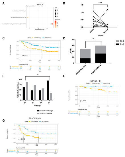 Analysis in FUSCC RNA sequence and PCR data. (A) Upregulated pathways analyzed by GSEA in FUSCC RNA sequence data. (B) LINC01094 expression was evaluated in 106 paired cancerous and noncancerous tissues from FUSCC. (C) For the whole cohort, the Kaplan–Meier curve showed that LINC01094 high expression was associated with an unfavorable prognosis. Patients in the LINC01094 high-expression group had higher T (D) and N (E) stages. (F) For the stage I–II subgroup, the Kaplan–Meier curve showed that LINC01094 high expression was associated with an unfavorable prognosis. (G) For the stage III–IV subgroup, the Kaplan–Meier curve showed that LINC01094 high expression was associated with an unfavorable prognosis. *: p < 0.01, ***: p < 0.001.