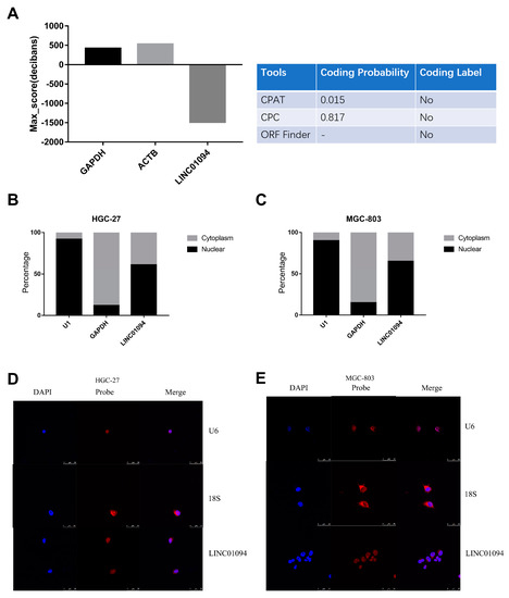 The characteristics of LINC01094 in GC. (A) LINC01094 was predicted as a noncoding RNA by PhyloCSF, CPAT, CPC, and the ORF finder. QRT-PCR for the separated nuclear and cytoplasmic fraction of HGC-27 (B) and MGC-803 (C) cell lines showed that LINC01094 was in both the nucleus and the cytoplasm. FISH assay showed that LINC01094 was in both the nucleus and the cytoplasm in the HGC-27 (D) and MGC-803 (E) cell lines (objective: 63×). The scale bar equals 50 μm, as indicated in each graph.