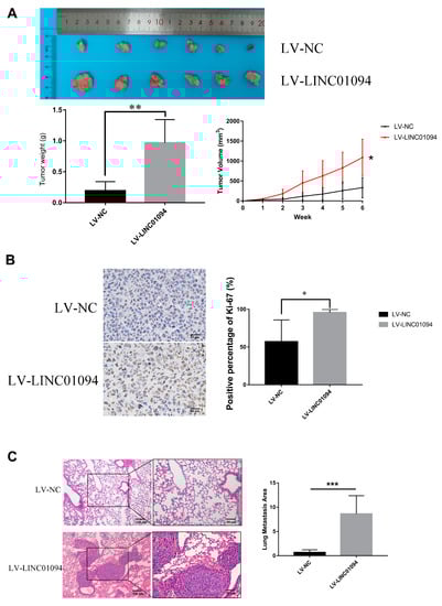 We also investigated the function of LINC01094 on GC growth and metastasis in vivo. As is shown in Figure 7A, after overexpressing LINC01094, the proliferation of the MGC-803 cells was strengthened in vivo. The IHC staining of Ki-67 verified the effect of LINC01094 on GC growth (Figure 7B). As for the metastasis model, the area of lung metastasis in the LINC01094 overexpression group was significantly larger than that of the NC group. Figure 7C showed the representative HE-stained slice pictures and the comparison of the area of lung metastasis for the NC and LINC01094 overexpression groups.