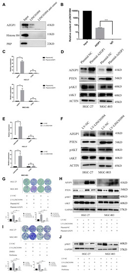 The LINC01094 antisense oligonucleotide (ASO) and the corresponding negative control (NC) ASO were purchased from RiboBio (Guangzhou, China). The AZGP1 and PTEN overexpression plasmid and the corresponding NC plasmids were purchased from Hanyin Biotechnology (Shanghai, China). The AZGP1 and PTEN overexpression plasmid were constructed in the pcDNA3.1 vector. According to the manufacturer’s instructions, the ASOs and plasmids were transfected into the cells using Lipofectamine 3000 for transient transfection. The LINC01094 overexpression lentiviral package was completed by Hanyin Biotechnology (Shanghai, China). The HGC-27 and MGC-803 cells were infected with LINC01094 overexpression lentivirus. The stable LINC01094 overexpression cells were selected by puromycin.
