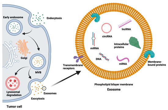 As the field of liquid biopsy continues to expand and refine, the value of exosomes as an important alternate platform is being increasingly recognized. Exosomes are extracellular vesicles (EVs) surrounded by a lipid bilayer membrane that range in size between 40 and 160 nanometers [6]. Exosome biogenesis begins with invagination of the cell membrane, then continues with a tightly regulated process with active sorting and packaging of exosomal content (Figure 1) [6,7]. Exosomes contain a variety of substances such as lipids, proteins, DNA, messenger RNA (mRNA), short single-stranded microRNAs (miRNAs, 18–25 nucleotides (nt)), long non-coding RNAs (lncRNAs, >200 nt), and novel circular RNAs (circRNA) (Figure 1) [6,8,9]. Besides the common cargo, some of the contents of exosomes are specific to their cell of origin and can be used to identify the source [10].