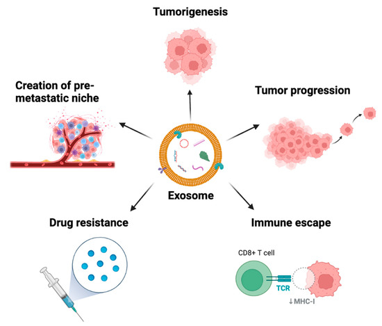 The function of exosomes was originally described by Pan and Johnstone as they tracked the loss of transferrin receptors via released vesicles during reticulocyte maturation [11]. Previously regarded as “garbage bins”, a plethora of preclinical and human studies have now demonstrated the active role of exosomes in cancer intercellular communication [12]. Exosomes play key roles in cancer, including creation of the premetastatic niche, tumorigenesis, tumor progression, immune escape, treatment resistance, and signaling between tumor cells and the surrounding tumor microenvironment (Figure 2) [13,14]. Hence, the content of exosomes could potentially be used as biomarkers, particularly since exosomes are readily found in a variety of biofluids and are produced more by malignant cells than normal cells (Figure 3) [8,13].