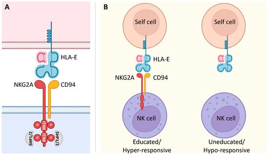 NKG2A signaling and its involvement in NK cell education. (A) The C-type lectin NKG2A receptor forms a heterodimer with CD94. It is characterized by a long cytoplasmic domain that contains two ITIMs. Upon binding to its ligand, inhibitory signaling of the non-classical MHC class I molecule HLA-E is based on the phosphorylation of two ITIMs with the consequent recruitment of the intracellular phosphatases SHP-1 and SHP-2. (B) NKG2A is known to be involved in NK cell education. In fact, the interaction of NKG2A with its ligand HLA-E renders NK cells educated and hyper-responsive, setting their effector functions at higher levels in response to stimulatory activation. On the other hand, NK cells that fail this interaction due to the lack of NKG2A are uneducated and hypo-responsive.