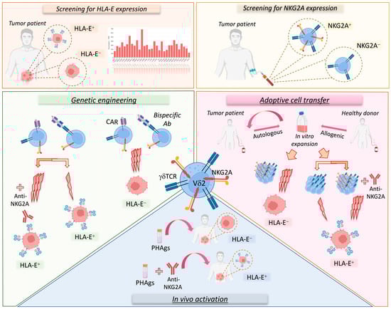 Since overexpressed HLA-E can prevent tumor cell lysis mediated by Vδ2 T cells, the blockade of the NKG2A-HLA-E axis may enhance the Vδ2 T cell-based immunotherapeutic efficacy by administering anti-NKG2A/CD94 mAb to unleash Vδ2 T effector functions. Furthermore, the differences in the anti-tumor potential of NKG2A+ and NKG2A− Vδ2 T provide functional indications of their potential uses and indicate the optimal choice according to the immunosuppressive HLA-E-mediated TME.