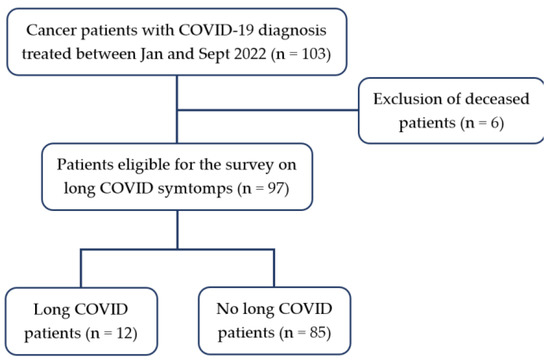 The enrolled patients were invited to take part in the survey by telephone at least 12 weeks after COVID-19 diagnosis in order to evaluate the incidence of long COVID symptoms. The survey consisted of a predefined list of the most common symptoms of long COVID symptoms: respiratory symptoms (breathlessness/cough), fatigue, anosmia, ageusia, hair loss, chest pain, palpitations, diarrhea, skin rashes, brain fog, headache, cough and myalgia. Oncologists conducted the telephone survey in order to discriminate as far as possible between the symptoms related to the oncological disease/oncological treatment and the long COVID symptoms.
